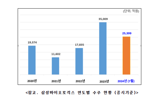 삼성바이오로직스는 이번 계약으로 연 누적 수주금액 2조 5천억원을 돌파했다. 올해 들어 글로벌 제약사와 총 7건의 계약을 체결했고 이 중 6건은 기존 계약의 생산 물량 등을 늘린 증액 계약이다.
