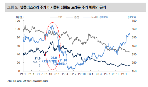 김회재 연구원은 "넷플리스와의 주가 디커플링 심화도 드래곤 주가 반등의 근거"라며 "스튜디오드래곤은 2017년부터 2023년까지 캡티브 비중 80%대, 자체기획 비중 20%대, 글로벌 OTT향 공급은 Volume Deal(연간 계약 물량 공급) 등의 전략으로 외형 성장을 했다"고 설명했다.