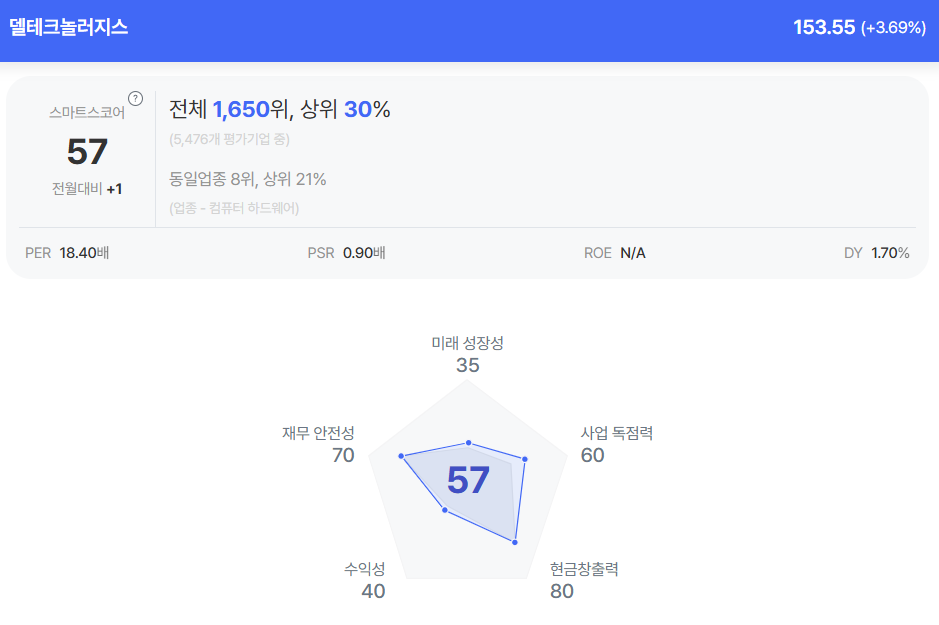| 델테크놀러지스 종목진단 (출처=초이스스탁) |