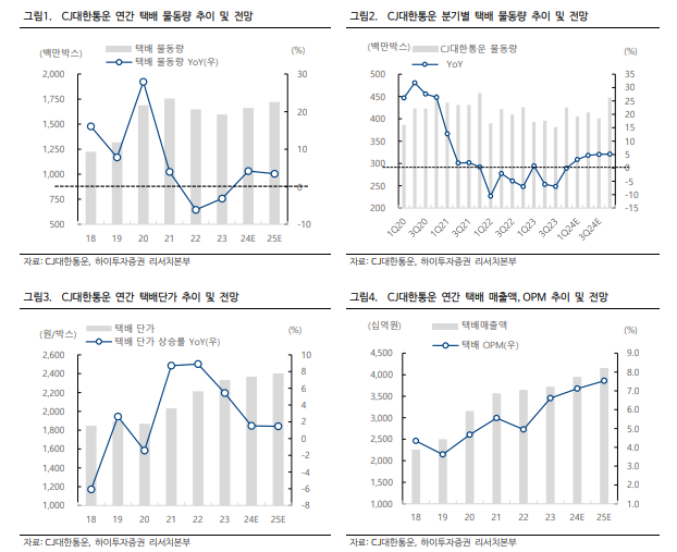 택배 부문은 버티컬 커머스와 해외 직구 물량이 전년동기대비 두 자릿수 성장한 것으로 추정되며, 이에 택배 물동량도 전년동기대비 3.1% 늘어난 것으로 보인다. 전년동기와 유사한 택배 단가에도 물동량 증가에 따른 레버리지 효과로 큰 폭의 영업이익 성장이 예상된다는 평가다.