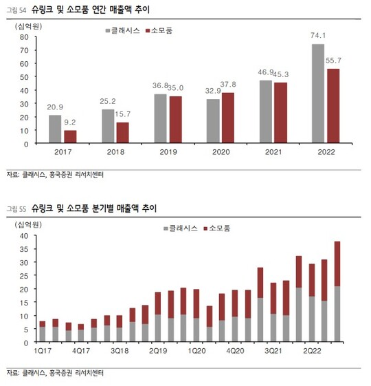 이나경 흥국증권 연구원은 "슈링크(슈링크 유니버스 포함)의 고마진 소모품, 슈링크 본체는 매출이 2017년 92억원에서 2022년 556억원으로 역성장 없이 매년 증가하고 있다"며 " 이는 슈링크에 락인되어있는 기존 고객으로부터 발생하는 꾸준한 소모품 매출에 신규 진입 고객의 소모품 매출이 더해진 효과가 포함되어 있다"고 판단했다.