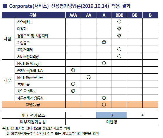 한국기업평가는 서비스 기업 신용평가방법론에 따라 산업매력도, 다각화, 경쟁구조 및 시장지위, 고정거래처, 서비스관리역량 등의 항목에서 컴투스를 투기급에 가까운 BBB급으로 평가하고 있다.