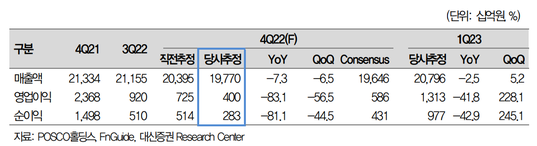 18일 대신증권은 포스코의 지난 4분기 매출 19조8000억원(-7.3% yoy), 영업이익 4002억원(-83.1% yoy), 영업이익률 2.0%(-9.1%p yoy) 등으로 전망했다. 이는 기존 컨센서스보다 낮은 수치다.