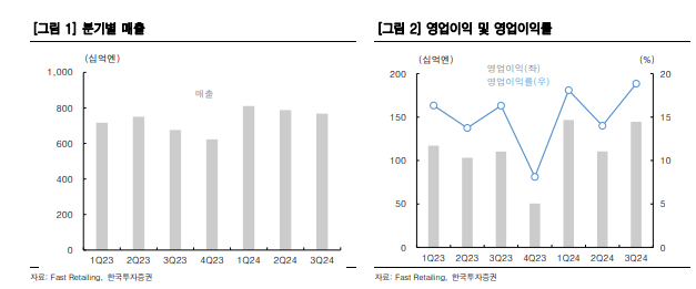 한국투자증권에 따르면, 패스트리테일링의 3분기(3월~5월) 매출액은 7675.0억 엔으로 전년 대비 13.5% 증가하고, 영업이익은 1447.2억 엔으로 31.2% 늘어 컨세서스를 모두 상회했다. 북미, 유럽, 동남아시아 지역에서 유니클로 판매가 늘면서 일본 유니클로 매출도 사상 최고치를 경신했다. 3분기 영업이익률은 18.9%로 전년동기와 전분기 대비 개선됐다.