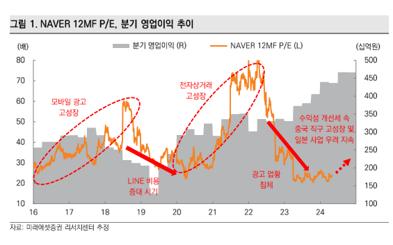 NAVER의 올해 예상 주가수익비율(PER)은 22배로 지난 2016년 이후 밸류에이션 하단에서 거래 중이다. 낮아진 멀티플과 높아진 2024년 실적 가시성을 고려 시 매수에 부담스럽지 않은 구간이라는 판단이다.