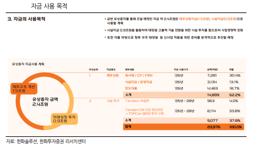 이용욱 연구원은 "차세대 '텐덤 셀' 기술 확보에 투입하여 중국발 치킨게임이 심화된 실리콘 셀 시장을 넘어 기술 초격차 기반의 고수익 구조로 전환할 방침"이라며 "다만 양산 시점까지의 기술 격차 유지와 단기적인 태양광·화학 업황의 회복 지연이 핵심 변수인데, 업황 반등이 늦어질 경우 증자 효과는 재무구조 개선에만 그치고 성장으로 이어지지 못할 리스크가 존재한다"라고 말했다.