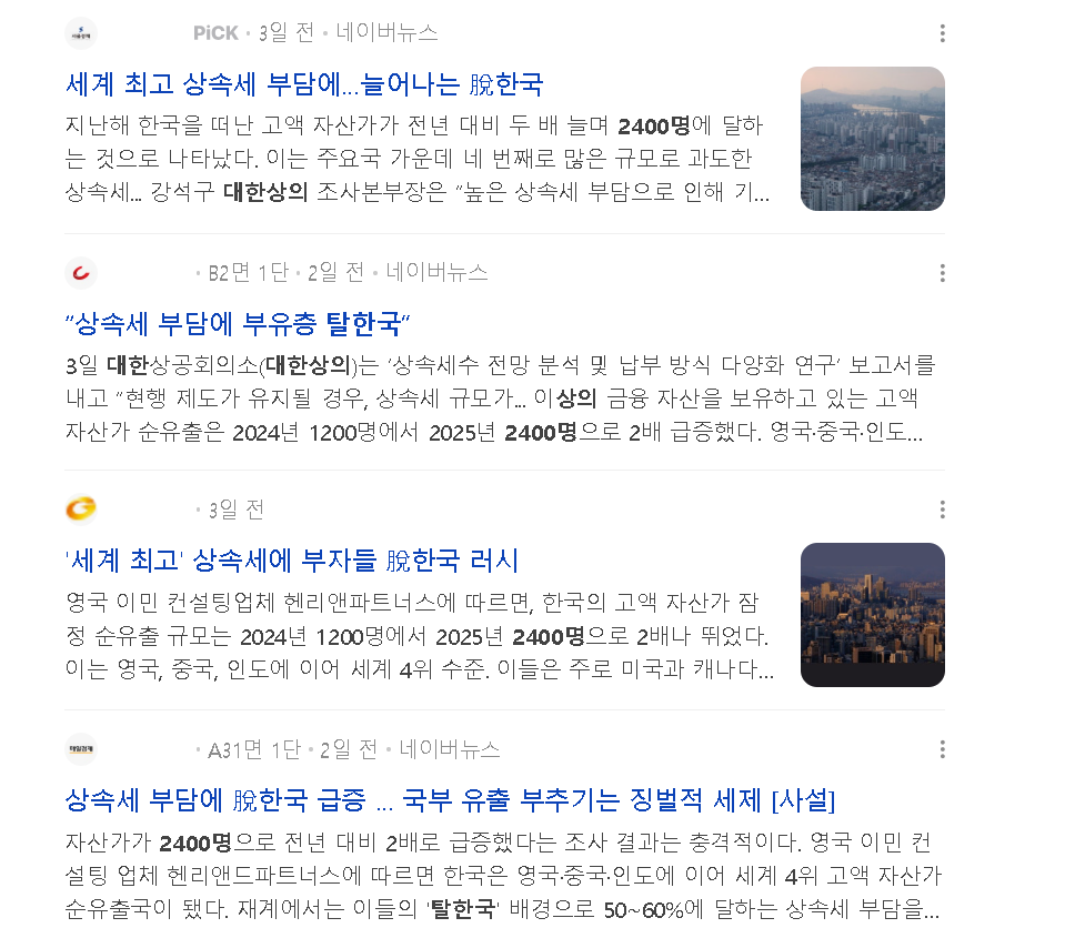 지난 3일 대한상의는 ‘상속세수 전망 분석’ 보고서를 통해 지난해 한국의 고액 자산가(금융자산 100만 달러 이상) 2400명이 해외로 이주했으며, 그 주요 원인이 ‘세계 최고 수준의 상속세’라고 발표했습니다.