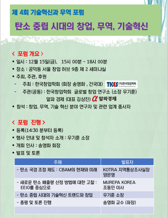 [알파경제=김교식 기자] 탄소중립시대 창업과 무역, 기술혁신에 대한 폭넓은 논의가 이뤄질 ‘학술 포럼’이 열린다.