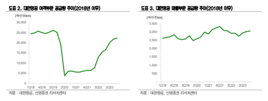 엄경아 신영증권 연구원은 "2024년까지 글로벌 항공여객시장 노선 공급은 코로나 이전 수준을 회복할 것으로 예상된다"며 "코로나 이전 대비 높은 소비 양극화를 감안하면 단가 하락 속도가 느릴 것으로 전망되지만 연간 기준 주당순이익(EPS) 성장 장담은 어렵다"고 판단했다.