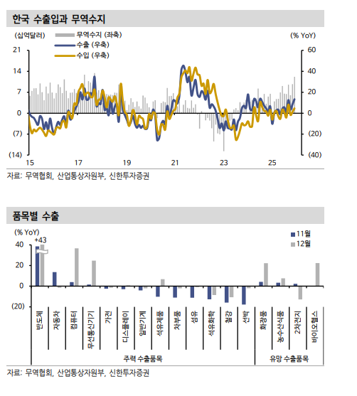 이진경 신한투자증권 연구원은 "2025년 양호한 한국 수출을 이끌었던 요인들의 훼손 가능성을 경계해야한다"며 "구조적인 AI 수요가 전체 한국 수출을 이끌었던 2025년의 흐름이 2026년에도 이어질 것"이라고 전망했다.