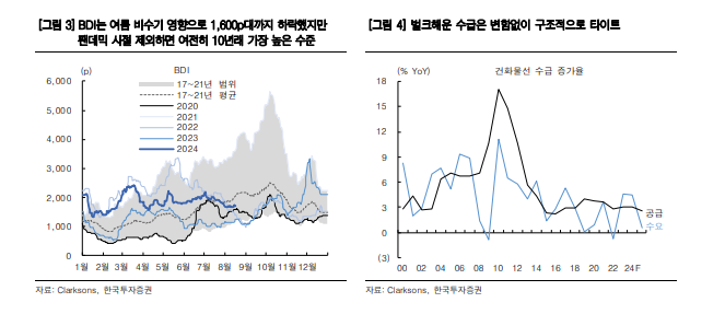 중국의 철강시황 부진을 감안해도 올해 건화물 물동량 전망치는 상향되고 있는 반면 그동안의 신조발주 투자 부족으로 공급증가는 제한적이다.