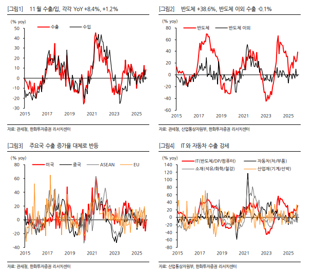 한화투자증권에 따르면, 11월 한국 수출은 610.4억 달러로 전년동월대비 8.4% 증가, 수입은 513.0억 달러로 1.2% 증가했다. 일평균 수출은 27.1억 달러로 전년동월대비 13.3% 증가했고, 반도체와 선박 제외 일평균 수출도 5.4% 늘었다.