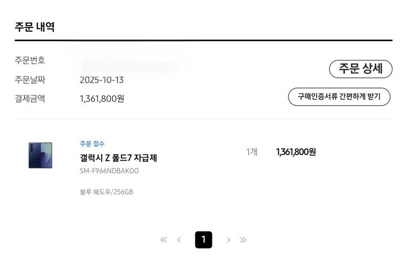 14일 온라인 커뮤니티에 따르면 지난 13일 새벽 삼성스토어에서 폴드7 256GB 모델이 136만1800원에 판매됐다.