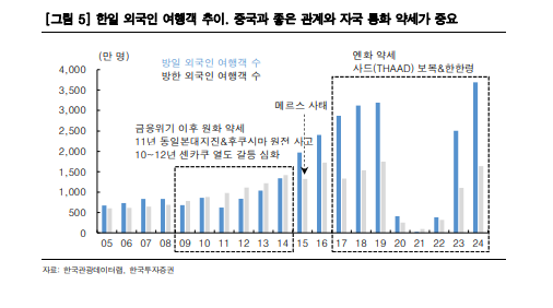 박기훈 한국투자증권 연구원은 "과거 사례를 볼 때 주변국 갈등과 환 약세 조합은 강한 관광 수요 확대 요인"이라며 "단기 테마보다 면세점·호텔·여행레저 등 인바운드 구조적 수혜 업종에 관심을 가져야 한다"고 조언했다.