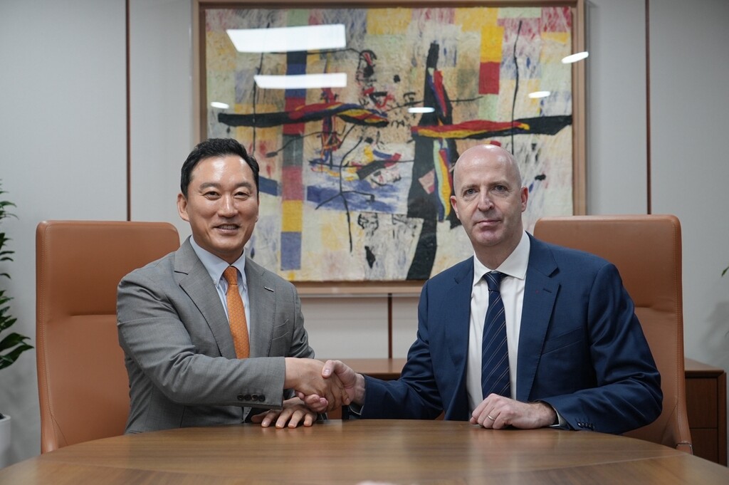 | 김성환 한국투자증권 사장(왼쪽)과 댄 왓킨스(Dan Watkins) JP모간 아시아태평양 CEO가 16일 서울 여의도 한국투자증권 본사에서 만나 전략적 비즈니스 협력방안을 논의한 뒤 기념촬영을 하고 있다. (사진=한국투자증권) |