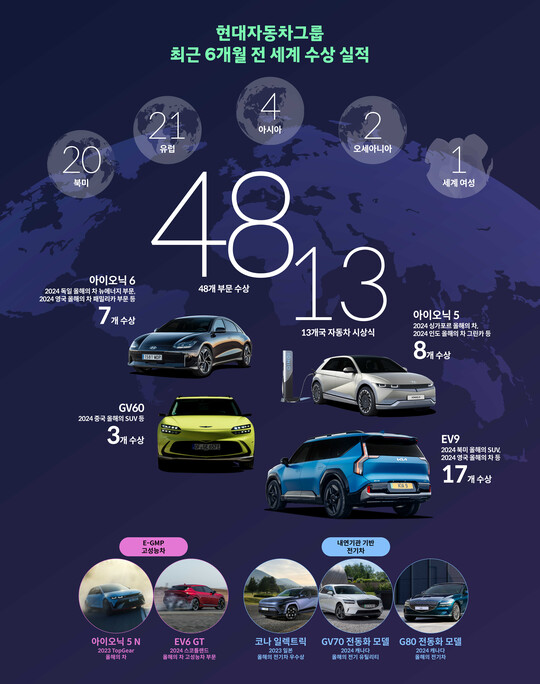 E-GMP(전기차 전용 플랫폼) 기반의 전기차 모델들이 주요하게 활약하는 가운데 최근 6개월간 13개국에서 진행된 다양한 자동차 시상식에서 초 48개 부문에서 수상하는 쾌거를 달성했다.