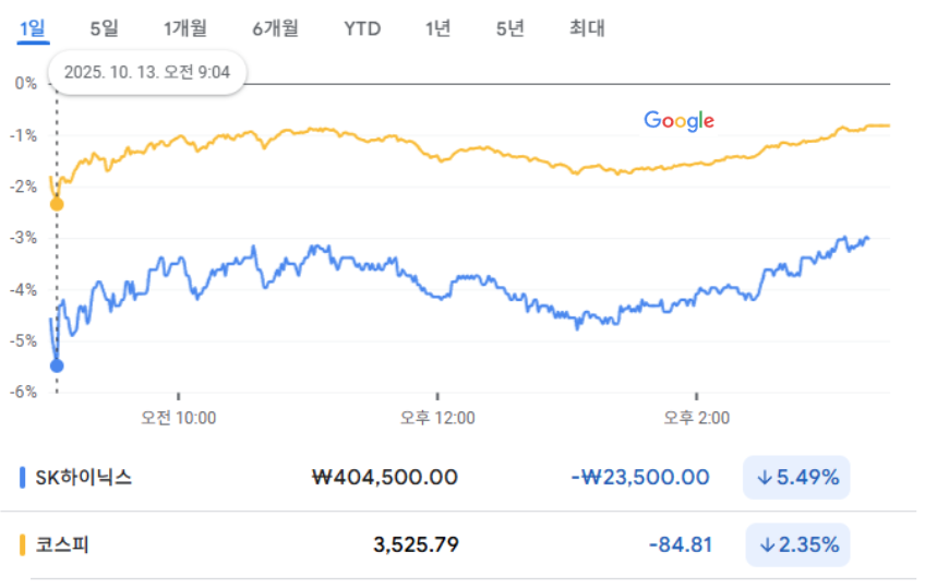 이 때문에 SK하이닉스도 오전 9시 4분 5.49% 떨어진 40만4500원까지 하락했다. 이후 횡보를 거듭하다 3% 하락으로 끝났다.