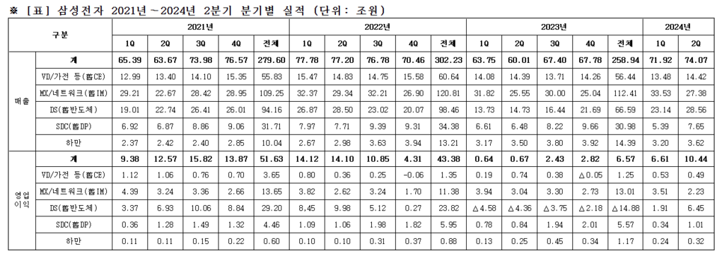 [알파경제=차혜영 기자] 삼성전자는 2024년 2분기 실적으로 ▲매출 74.07조원 영업이익 ▲10.44조원을 기록했다고 발표했다.