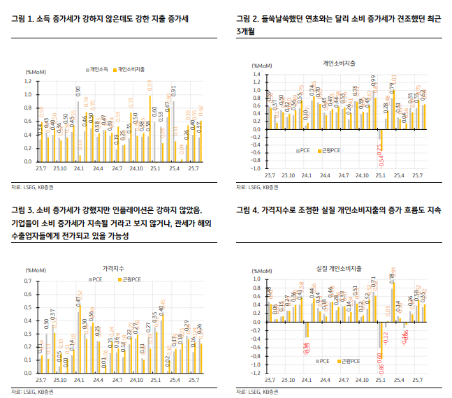 KB증권에 따르면, 미국의 8월 개인소비지출이 전월 대비 0.62% 증가하고 근원PCE는 전월 대비 0.64% 늘었다.