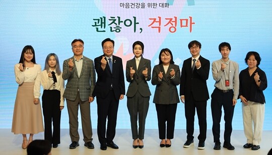 [알파경제=김종효 기자] 김건희 여사가 15일 오후 서울 중구 커뮤니티하우스 마실에서 열린 자살예방 캠페인 '괜찮아, 걱정마' 마음건강을 위한 대화에서 조규홍 보건복지부 장관, 윤대현 교수, 채선주 네이버 ESG 대표, 황태연 이사장을 비롯한 참석자들과 기념 촬영하고 있다.