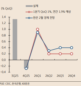 반면, 글로벌 성장률 상승에 따른 원자재 등의 전반적인 물가 상승 압력의 증가, 공공 부문의 누적된 물가 압력 현실화 가능성, 2025년 하반기 이후의 원화 약세 등을 감안하여, 2026년 소비자 물가 상승률 전망을 기존의 2.0%에서 2.1%로 소폭 상향했다.