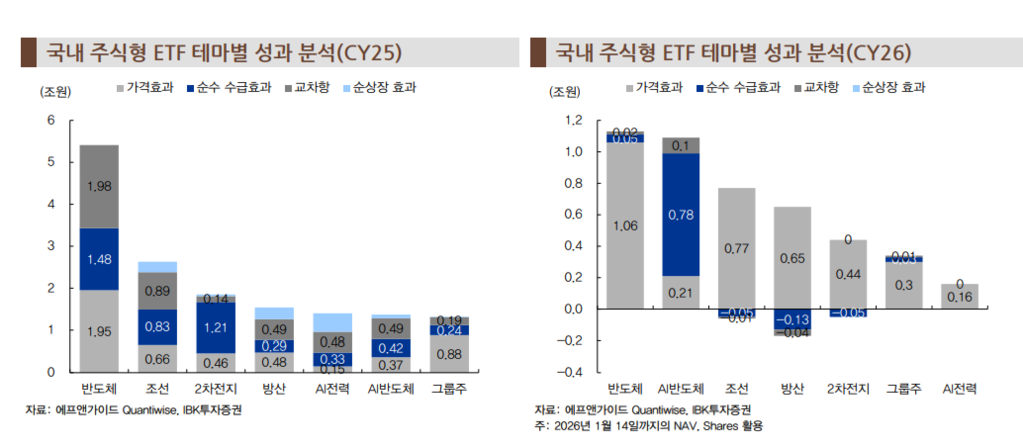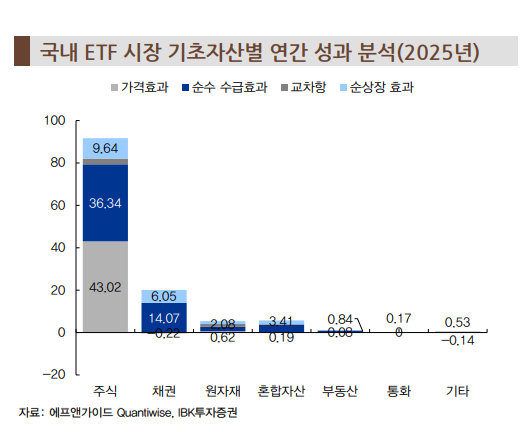 2025년 국내 주식형 ETF는 가격효과 34조4000억원, 수급효과 15조5000억원으로 가격 주도의 성과 축적이 두드러졌으며, 반도체·조선·방산 등 실적 가시성이 높은 업종 중심의 상승이 AUM 확대를 이끌었다.
