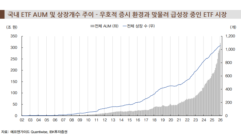 19일 IBK투자증권에 따르면 국내 ETF 시장 AUM은 지난 14일 기준 320조원을 돌파했다.