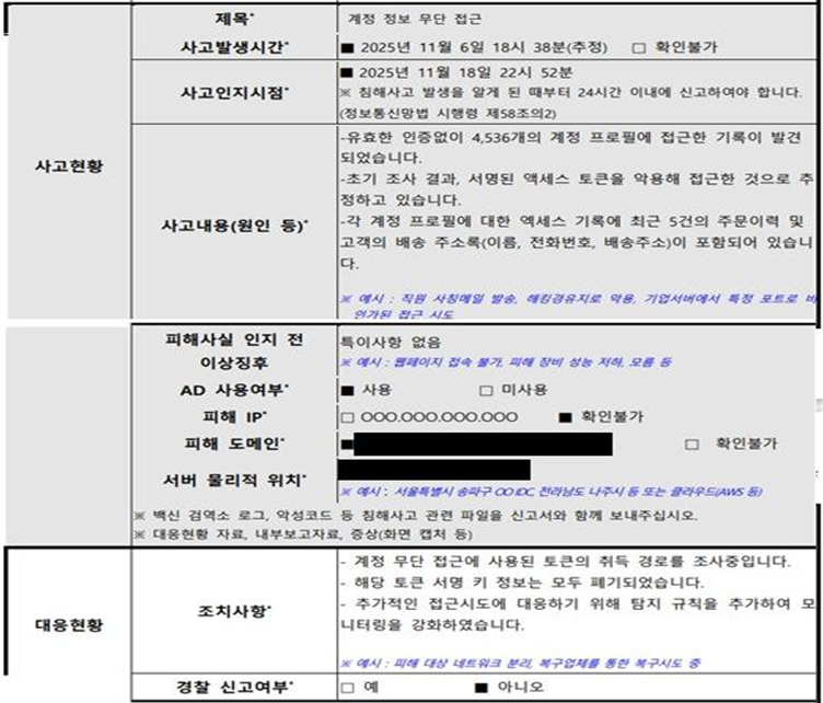 쿠팡은 사고 인지 시점으로부터 24시간이 지난 19일 오후 9시 35분에 KISA에 신고하여 법정 기한을 넘기지는 않았습니다.