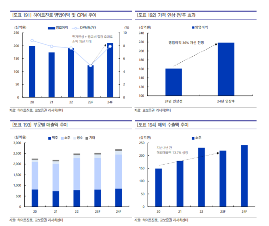 교보증권에 따르면, 하이트진로의 2024년 연결 매출액은 2조 6615억원으로 전년 대비 5.6% 증가하고, 영업이익은 2105억원으로 70% 늘어날 것으로 추정된다. 올해는 2023년 11월 가격 인상 효과와 켈리 마케팅비용 절감 효과 기인해 손익이 큰 폭으로 증가할 것이란 전망이다.