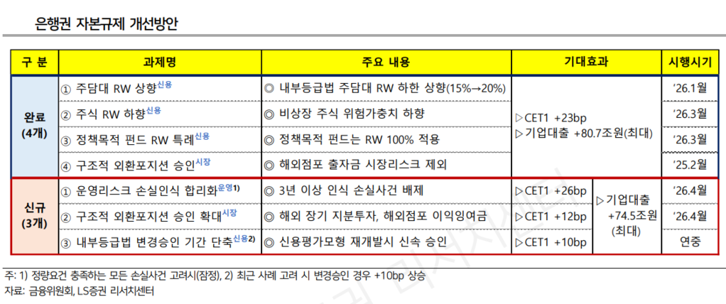 전배승 연구원은 "향후 발생 가능한 과징금과 환율변동성에 따른 부정적 영향을 축소시키고, 특히 1분기 중 환율상승으로 인한 CET1비율 하락이 예상되는 상황에서 주주환원 확대 기대감이 유지되는 긍정적 효과가 예상된다"라며 "자본규제 개선의 취지가 생산적금융 관련 자금공급 확대에 초점을 맞추고 있어 증대된 자본여력이 주주환원 재원으로만 활용될 가능성은 낮지만 그럼에도 자본비율 상승효과가 예상된다는 측면은 충분히 긍정적으로 해석 가능하다"라고 덧붙였다.