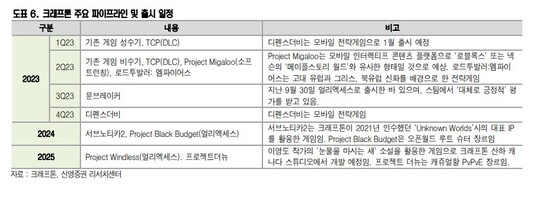 김혜령 신영증권 연구원은 "TCP의 기대에 못 미치는 성과는 이미 주가에 반영되었다고 판단한다"며 "올해 기대작 출시가 없음에도 불구하고 영업이익 5000억원 달성이 가능하고, 4조원 가량의 현금성자산을 보유하고 있으며, 2024년과 2025년 파이프라인 준비에 국내 게임사와 비교해 가장 적극적이다는 점을 고려하면 현재 크래프톤의 주가는 현저하게 저평가되어 있다"고 판단했다.