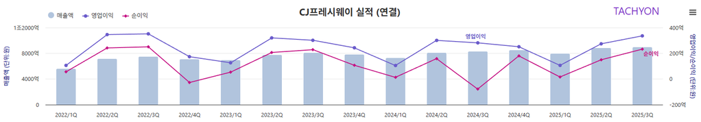 CJ프레시웨이는 3분기 연결기준 매출 9012억 원, 영업이익 336억 원을 기록했다. 전년대비 매출은 8.3%, 영업이익은 19.3% 늘어났다.