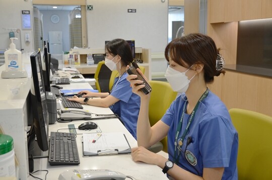 | 서울목동병원 병동 의료진이 LTE무전기 ‘라져’를 사용하고 있다. (사진=아이디스파워텔) |