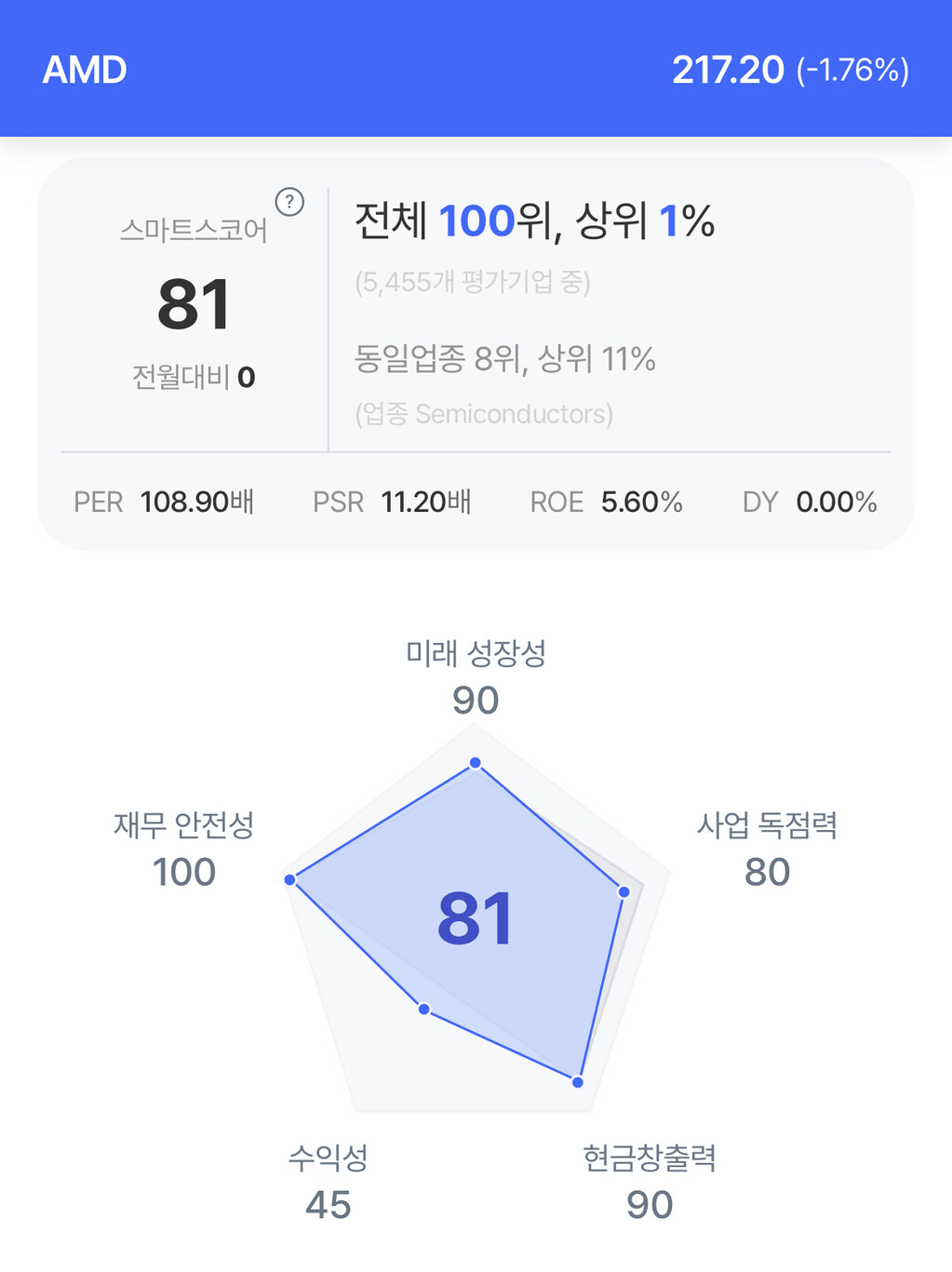 주가는 이날 AI PC용 라이젠 AI 400 시리즈와 고성능 라이젠 AI 맥스+ 칩도 함께 공개하면서 1.76% 상승한 217.20달러를 기록했다.