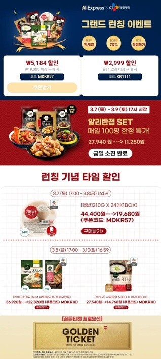 알리는 이번 CJ제일제당의 입점을 대대적으로 홍보하며 특히 휴대폰 앱 첫 화면에 광고를 게재하고, 다양한 팝업 광고로 소비자의 관심을 유도하고 있다.