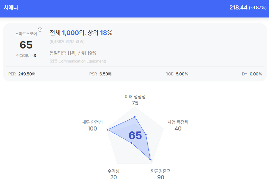 시에나의 12개월 선행 주가수익비율(PER)이 상장 이후 최고 수준인 41배까지 상승했다. 전통 통신장비 회사로 인식되다가 Scales-across 투자 본격화되며 AI 관련 주로 리레이팅된 영향이란 분석이다.