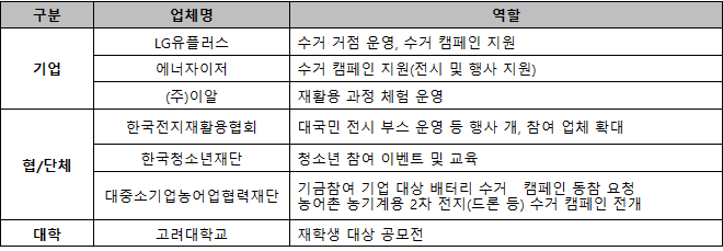 이들은 대국민 폐배터리 수거 활동, 교육 및 캠페인, 사회적 약자 지원, 제도개선, 경제·사회적 효과 분석 등을 추진할 예정이다.