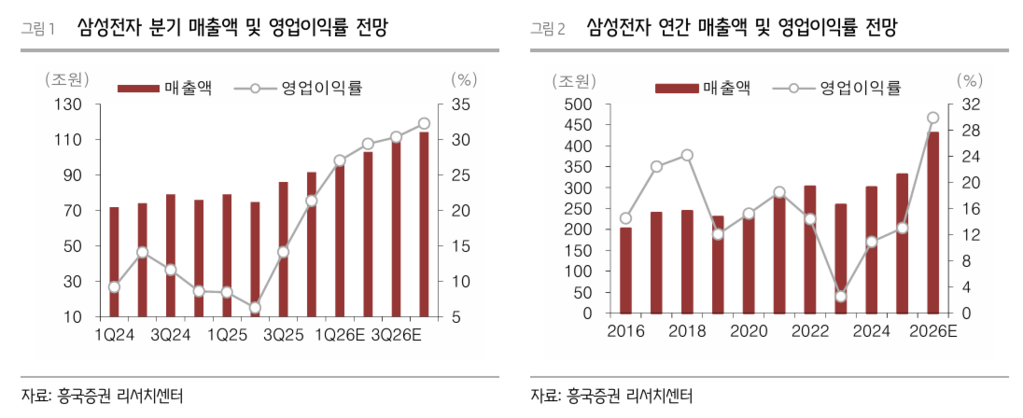 흥국증권은 삼성전자의 2026년 매출액은 전년 대비 30% 증가한 430조6000억원, 영업이익은 198% 증가한 128조6000억원을 기록할 것으로 전망했다.