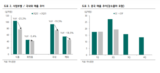 심은주 하나증권 연구원은 "작년 하반기는 베이스가 낮고 ‘콜마스크’ 연결 효과 감안시 매출액은 전년 대비 증가할 것으로 판단되나, 애터미 향 매출 회복 속도가 예상 대비 더딜 것"이라며 "전반적인 국내 소비 경기 부진도 부담"이라고 지적했다.