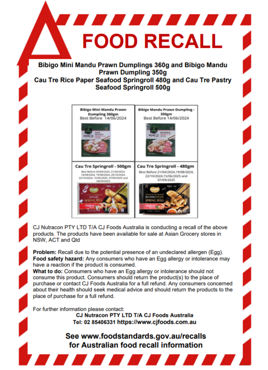 호주식품기준청(FSANZ)은 "24일(현지시간) 해당 제품들에 미신고된 알레르기 유발 물질(계란)이 잠재할 수 있다"고 공지하며 "계란 알레르기나 불내증이 있는 소비자는 제품을 섭취하지 말 것"을 당부했다.