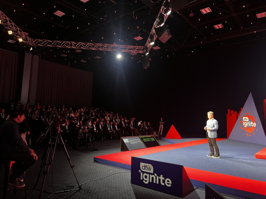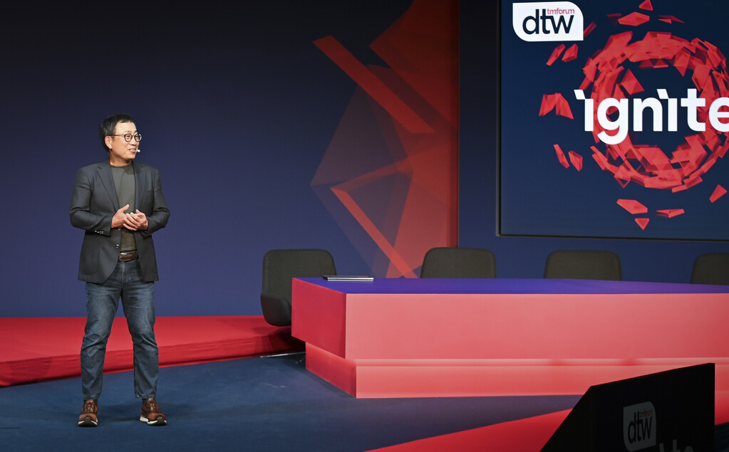 코펜하겐에서 열린 TM포럼 주관 ‘DTW Ignite’ 행사에서 SKT 정석근 글로벌/AI 테크 사업부장이 기조연설 하는 모습(사진= SKT) |