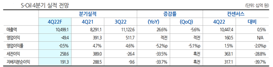 26일 현대차증권은 S-Oil이 지난 4분기 매출 10조5000억원(-5.6% qoq, +26.6% yoy), 영업이익 -494억원(적전 qoq, 적전 yoy)을 기록할 것으로 전망했다.