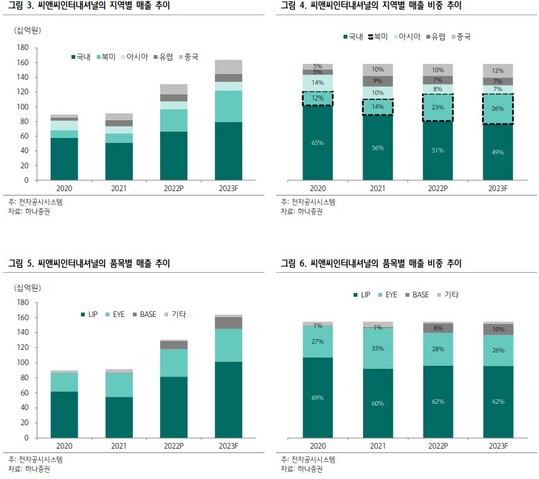 국내는 상장사와 인디, 유통사PB 브랜드로의 수주 확대가 나타나고 있으며, 중국 리오프닝 효과로 국내와 중국 색조 수요는 시장을 상회할 것으로 보인다. 특히 북미는 주력 고객사의 분기 매출 성장 가속화에 따른 수주 물량 확대와 추가적인 고객사 확대 등으로 매출 비중이 올해 지속적으로 확대될 전망이다.