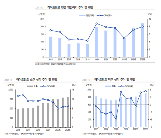 이베스트투자증권에 따르면, 하이트진로의 내년 예상 연결 매출액은 2조 6940억원으로 전년 대비 6.2% 증가했고, 영업이익은 1924억원으로 51.3% 증가할 것으로 추정된다. 지배주주순이익은 1008억원으로 94.3% 늘어나며 턴어라운드를 보여줄 전망이다.