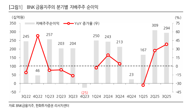 4일 금융투자업계에 따르면 BNK금융지주의 3분기 지배주주순익은 전년 동기 대비 38% 증가한 2942억원으로 컨센서스를 20% 상회하는 어닝 서프라이즈를 기록했다.