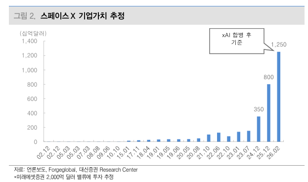 박혜진 대신증권 연구원은 "스페이스X의 기업가치는 6000억달러, xAI는 2300억달러 밸류까지 반영된 것으로 추정하고, 지난 2월 3일 합병을 완료한 바 기업가치는 1조2500억달러로 평가받은 것으로 파악돼 추가 평가익 버퍼는 현재까지 반영한 가치의 50.6%, 4200억원으로 추정한다"라고 분석했다.
