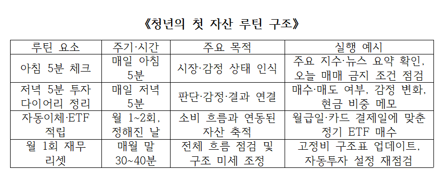 이처럼 하루 10분 루틴과 월 1회 재무 리셋이 결합되면, 돈과 감정을 관찰하는 ‘내적 루틴’이 소비–투자 구조를 점검하는 ‘외적 루틴’과 서로 보완적으로 작동하게 된다.