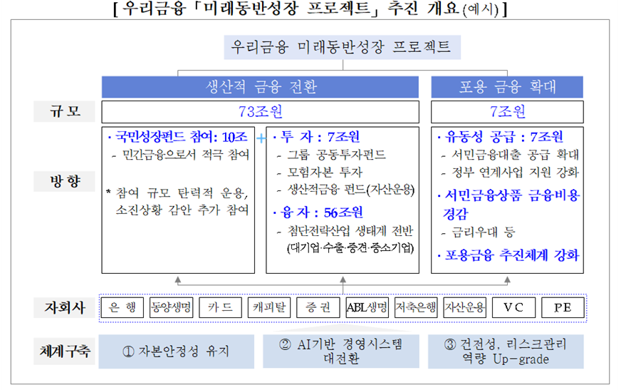 생산적 금융 73조원은 △국민성장펀드 참여 10조원을 비롯해 △그룹자체투자 7조원 △융자 56조원으로 구성됐다. 이 중 국민성장펀드 10조원은 지난달 10일 이재명 대통령이 국민보고대회에서 국민성장펀드 150조원을 제시한 이후 민간 첫 추진 사례로 민간·국민기금 75조원의 약13%에 달하는 규모다.