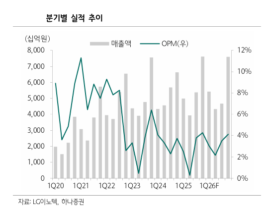 28일 금융투자업계에 따르면 LG이노텍 4분기 매출액은 전년 동기 대비 14.8% 증가한 7조 6098억원, 영업이익은 31.0% 증가한 3247억원으로 최근 높아진 컨센서스 영업이익 3708억원을 하회했다.