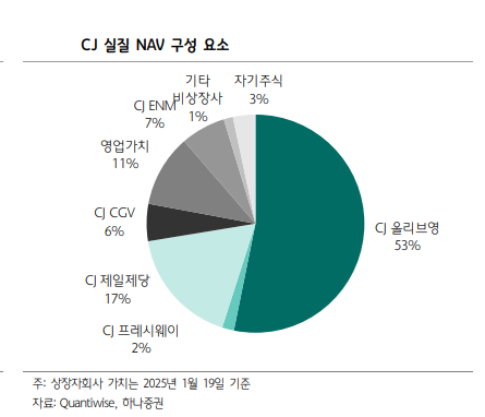 하나증권은 20일 CJ에 대해 CJ는 보통주 7.3%의 자사주를 보유하고 있으며, 올리브영도 22.6%의 자사주를 보유하고 있다고 전했다.